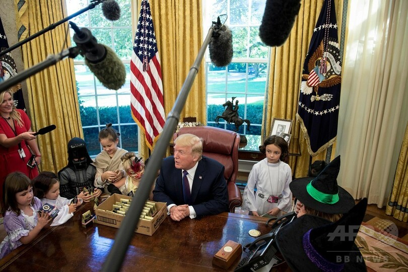 【10月28日 AFP】ドナルド・トランプ(Donald Trump)米大統領は27日、ハロウィーンを前に首都ワシントン(Washington D.C.)にあるホワイトハウス(White House)の大統領執務室(Oval Office)に、ホワイトハウス担当記者の子どもたちを招待した。(c)AFP