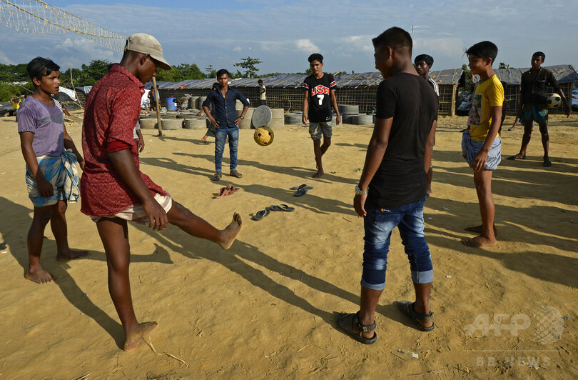 【11月19日 AFP】ミャンマーと国境を接するバングラデシュの町コックスバザール(Cox's Bazar)に近いクトゥパロン(Kutupalong)の難民キャンプ。竹製の仮設シェルターがひしめく中、残り少なくなった空き地でイスラム系少数民族ロヒンギャ(Rohingya)の少年たちがリフティングの一種であるチンロン(Chinlone)という球技に夢中になっていた。彼らにとっては今でも楽しめる数少ない娯楽の一つだ。