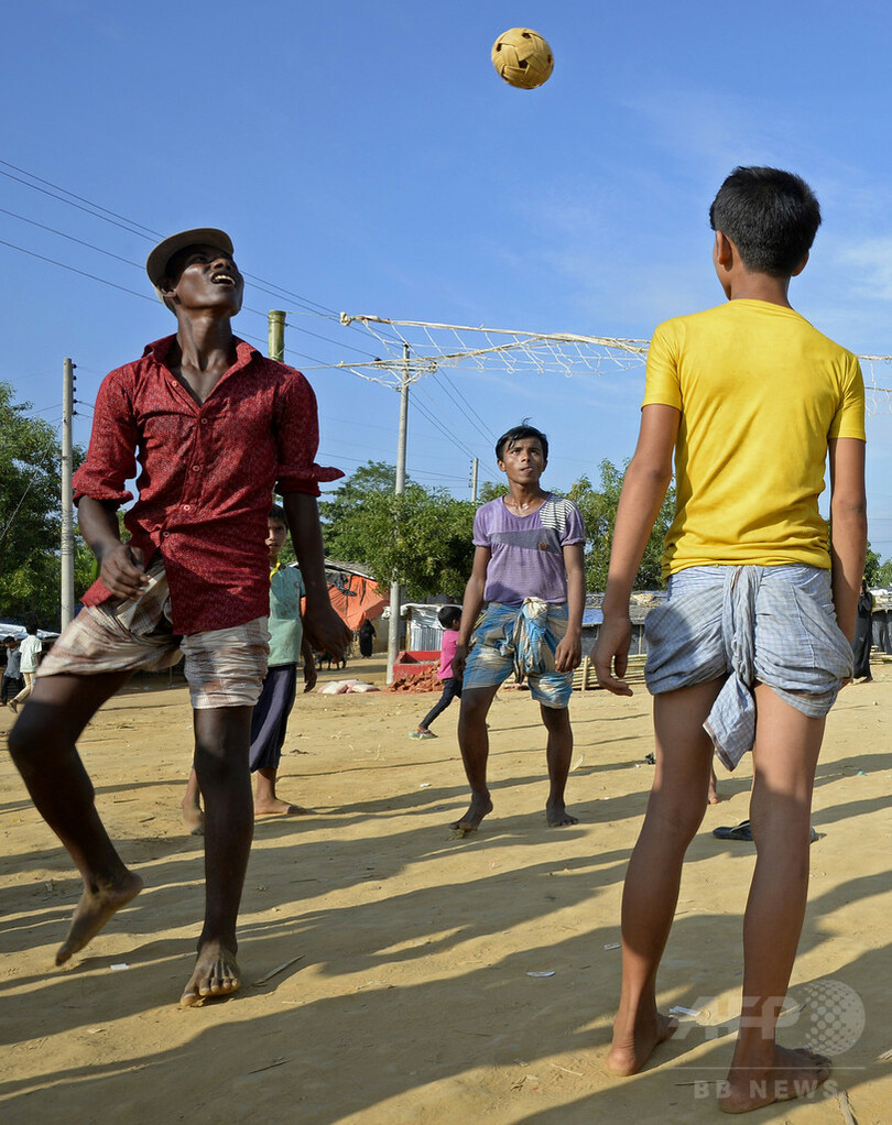 【11月19日 AFP】ミャンマーと国境を接するバングラデシュの町コックスバザール(Cox's Bazar)に近いクトゥパロン(Kutupalong)の難民キャンプ。竹製の仮設シェルターがひしめく中、残り少なくなった空き地でイスラム系少数民族ロヒンギャ(Rohingya)の少年たちがリフティングの一種であるチンロン(Chinlone)という球技に夢中になっていた。彼らにとっては今でも楽しめる数少ない娯楽の一つだ。