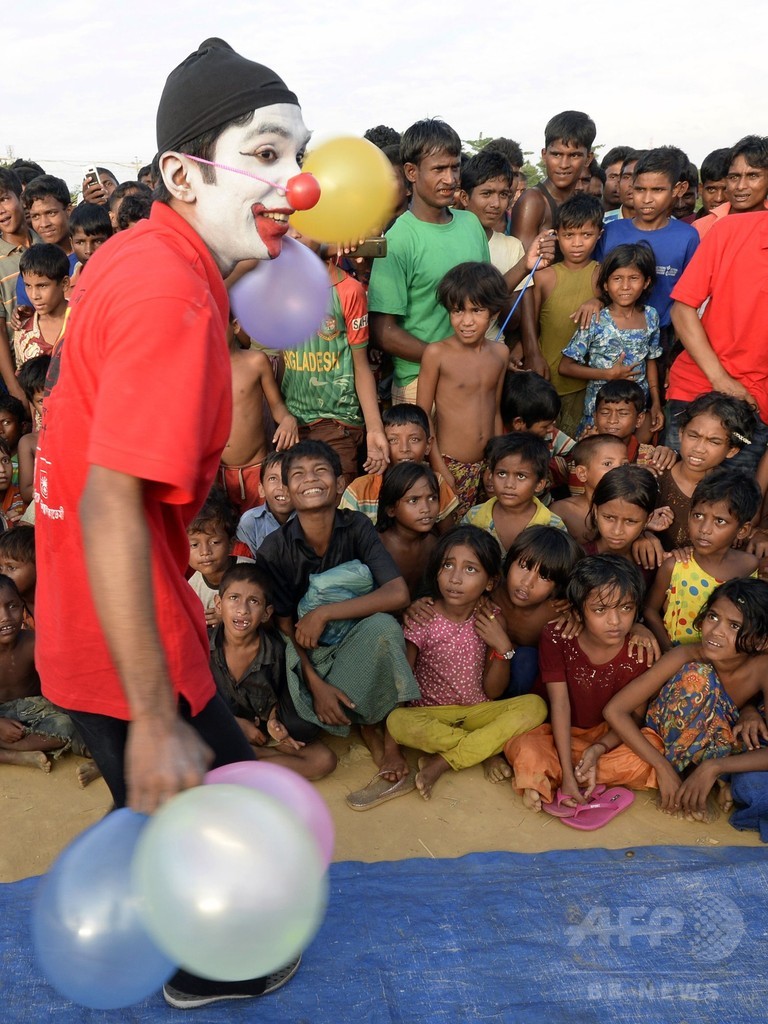 【10月31日 AFP】ピエロがジャグリングや宙返りをすると、イスラム系少数民族ロヒンギャ(Rohingya)の子どもたちはキャッキャッと歓声を上げた。ピエロたちのおどけたしぐさによって、世界最大規模の難民キャンプではめったに聞かれることのない音が響く──子どもたちの笑い声だ。