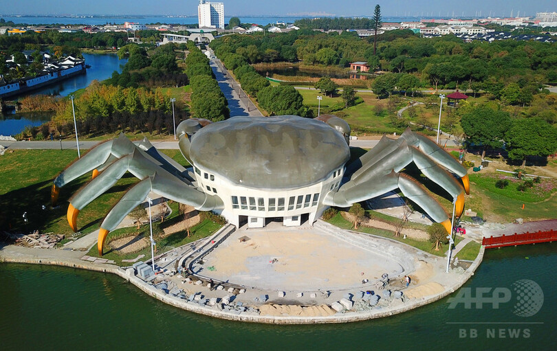 ステンレス製で、外形は継ぎ目も見当たらいほどの完成度だ。カニの腹部に当たる部分に3層の空間を作り、くつろぎスペースや娯楽、上海ガニに関連する体験コーナーなどを集めて一体化させた施設を作る予定だ。主要部分の建築はすでに完了しており、地面の景観を着工中。予定では、来年の下半期には完成し開園する見込みだ。(c)CNS/JCM/AFPBB News