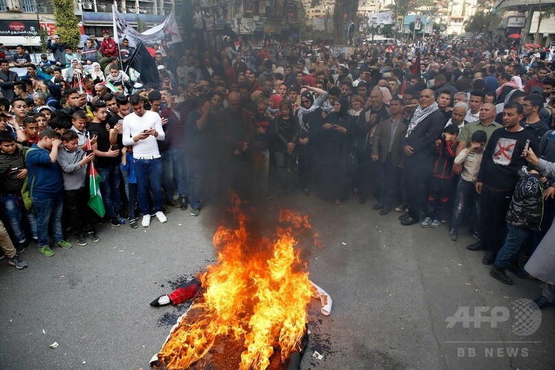ヨルダン川西岸(West Bank)のナブルス(Nablus)で行われたデモには約4000人が集まり、英国のテリーザ・メイ(Theresa May)首相とアーサー・バルフォア(Arthur Balfour)元首相を模したとみられる人形に火を付けた。