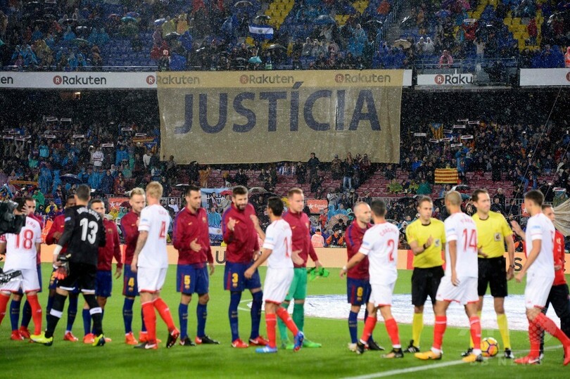 中央政府が自治州政府の閣僚8人を罷免し、反逆の罪で訴追することも考慮して勾留命令を出す中、この日のカンプ・ノウでは巨大なカタルーニャ州の旗と、英語とカタルーニャ語で「正義」と書かれた横断幕が掲げられた。欧州最大のスタジアムには、90分を通して「自由」の大合唱が響き渡り、バルセロナのゴール裏には「政治犯の釈放を」と書かれた紙や「恥を知れ欧州」と書かれた横断幕もあった。