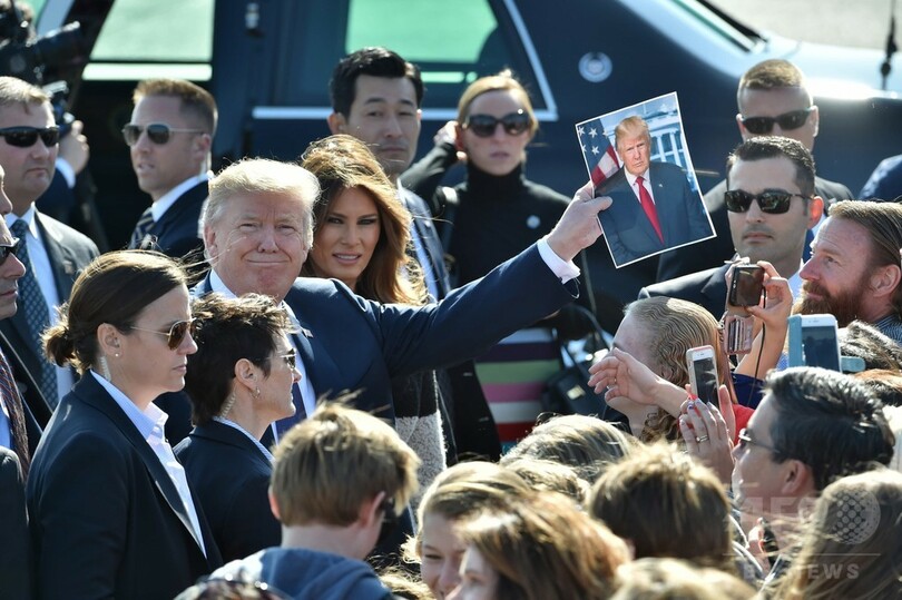 青空の下、東京の米軍横田基地(Yokota Air Base)に着陸した大統領専用機エアフォースワン(Air Force One)からメラニア(Melania Trump)夫人とともに姿を現したトランプ大統領は、明るい日の光の中、出迎えた人々にあいさつした。