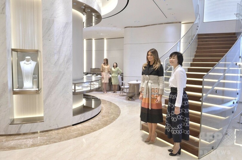 【11月5日 AFP】(写真追加)ドナルド・トランプ(Donald Trump)米大統領とともに来日したメラニア(Melania Trump)夫人は5日、安倍晋三(Shinzo Abe)首相の妻、昭恵(Akie Abe)夫人と東京・銀座の宝飾店「ミキモト(Mikimoto)」を訪れた。