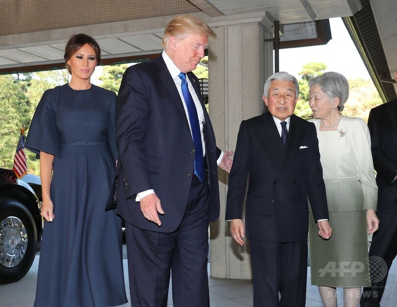 その後トランプ氏とメラニア(Melania Trump)夫人は、通訳を介して両陛下との会見に臨むため、御所内へと入って行った。(c)AFP