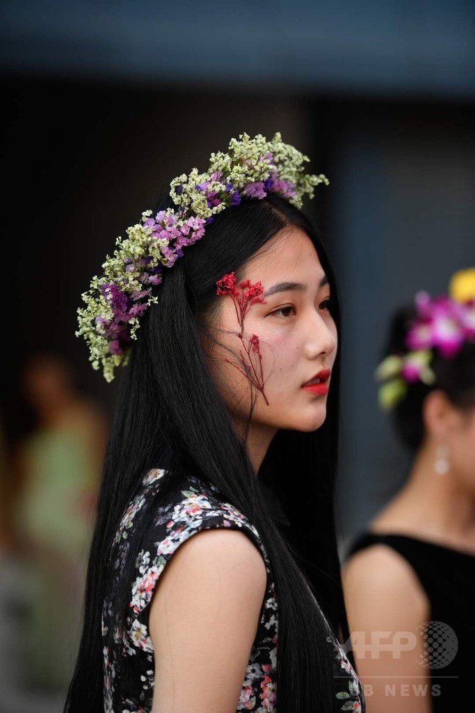 モデルが花の衣装で「花妖精」の座を争う 中国・昆明