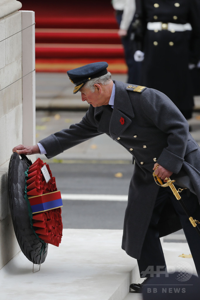 【11月13日 AFP】英ロンドンで12日、戦没者追悼記念日(リメンバランス・サンデー(Remembrance Sunday)の式典が行われ、エリザベス女王(Queen Elizabeth II、91)が毎年行ってきた慰霊碑に献花する役割をチャールズ皇太子(Prince Charles)が代行した。女王の公務縮小を印象付ける出来事といえる。