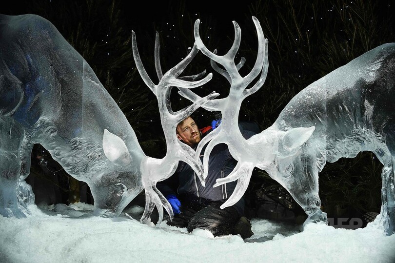 完成間近の氷の彫刻、英スコットランドで氷の祭典
