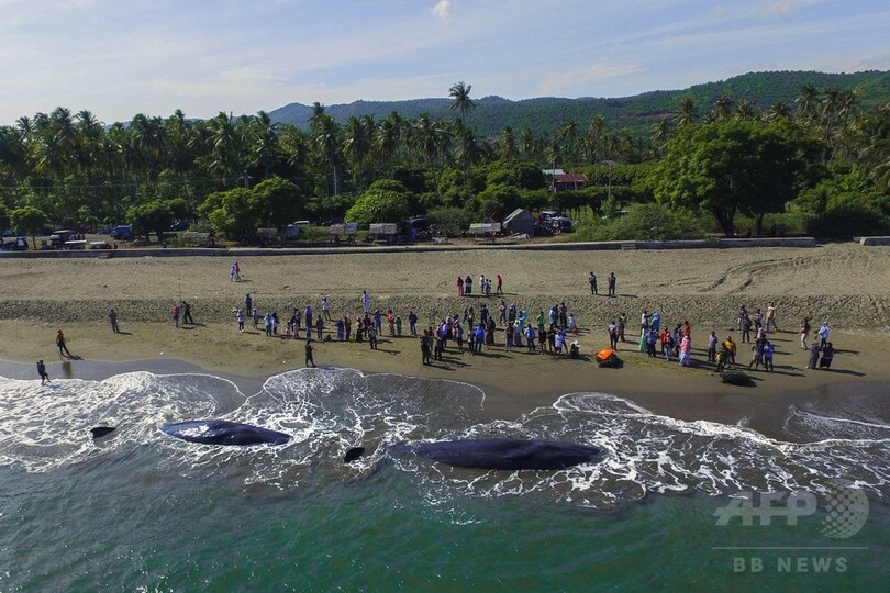 浜辺に打ち上げられたクジラ、9頭のうち4頭が死ぬ インドネシア