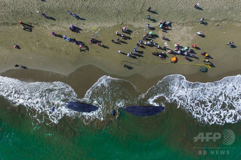 浜辺に打ち上げられたクジラ、9頭のうち4頭が死ぬ インドネシア