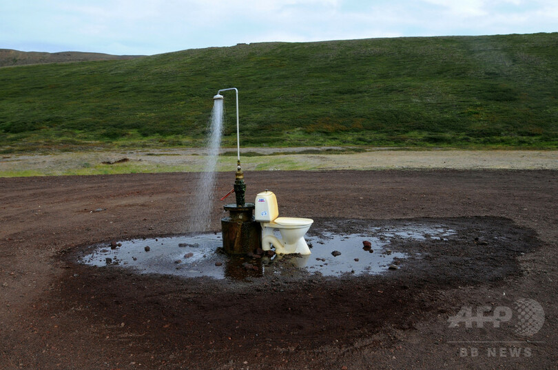 【11月16日 AFP】アイスランド北東部レイキャフリーズ(Reykjahlid)とミーバトン湖(Lake Myvatn)近くの、クラプラ(Krafla)地熱発電所に向かう途中の道沿いに露天のトイレと温水シャワーが設置されている。(c)AFP