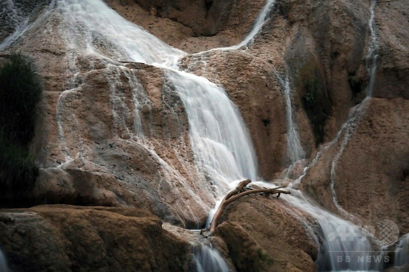 色鮮やかな青緑色の滝、メキシコ地震で干上がる 住民らが復旧に奮闘