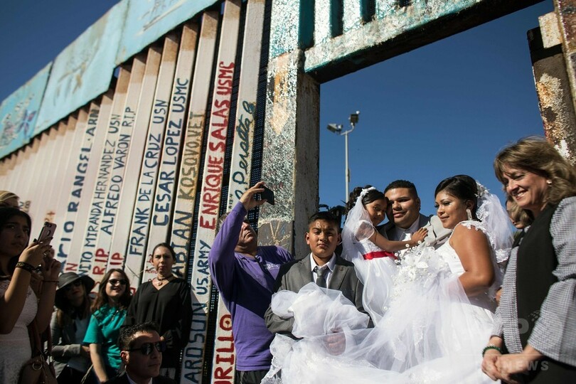 結婚式に出席した家族や友人たちのために、「希望の扉」という名で知られる国境フェンスの門を米国境警備隊が開放。式の立会人はティフアナ(Tijuana)市長の妻と、地元の人権団体の役員が務めた。