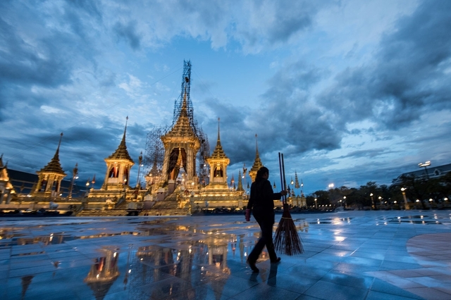 金色の火葬施設は高さが50メートルあり、数々の仏像やヒンズー教の神々の像で飾られていた。2人の男性(前国王の担当医ら)が骨つぼの入ったかごを担ぎ、その頂上へと運んだ。赤い服を着たワチラロンコン(Maha Vajiralongkorn)国王がロールスロイスに乗って到着すると、白髪頭の王宮の侍従たちがひざまずき、そのままの姿勢を保って後ずさりする。葬儀を担当する職員たちも花輪を床に置き、はいつくばるようにして下がっていく。