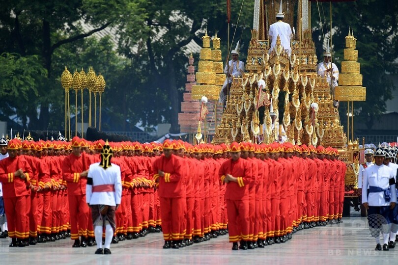 金色の火葬施設は高さが50メートルあり、数々の仏像やヒンズー教の神々の像で飾られていた。2人の男性(前国王の担当医ら)が骨つぼの入ったかごを担ぎ、その頂上へと運んだ。赤い服を着たワチラロンコン(Maha Vajiralongkorn)国王がロールスロイスに乗って到着すると、白髪頭の王宮の侍従たちがひざまずき、そのままの姿勢を保って後ずさりする。葬儀を担当する職員たちも花輪を床に置き、はいつくばるようにして下がっていく。