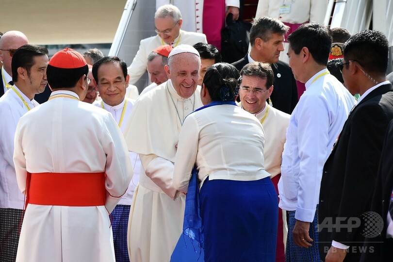 【11月27日 AFP】(更新)ローマ・カトリック教会のフランシスコ(Francis)法王(80)が27日、初めて訪問するミャンマーへ到着した。訪問日程は4日間。ミャンマー政府は現在、イスラム系少数民族ロヒンギャ(Rohingya)への対応をめぐり国際社会から非難を浴びており、微妙なタイミングでの訪問となる。
