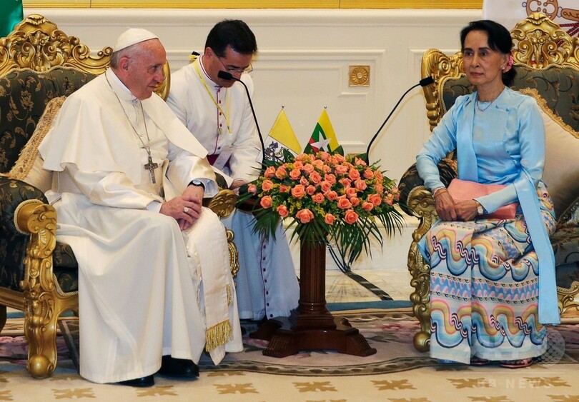 【11月28日 AFP】(更新、写真追加)ミャンマーを訪れているローマ・カトリック教会のフランシスコ(Francis)法王は28日、同国の事実上の指導者であるアウン・サン・スー・チー(Aung San Suu Kyi)国家顧問と会談した。また法王は演説で人権尊重を訴えたものの、イスラム系少数民族ロヒンギャ(Rohingya)への言及は避け、民族浄化との非難についても触れなかった。