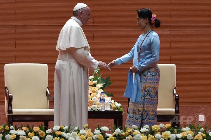 【11月28日 AFP】(更新、写真追加)ミャンマーを訪れているローマ・カトリック教会のフランシスコ(Francis)法王は28日、同国の事実上の指導者であるアウン・サン・スー・チー(Aung San Suu Kyi)国家顧問と会談した。また法王は演説で人権尊重を訴えたものの、イスラム系少数民族ロヒンギャ(Rohingya)への言及は避け、民族浄化との非難についても触れなかった。