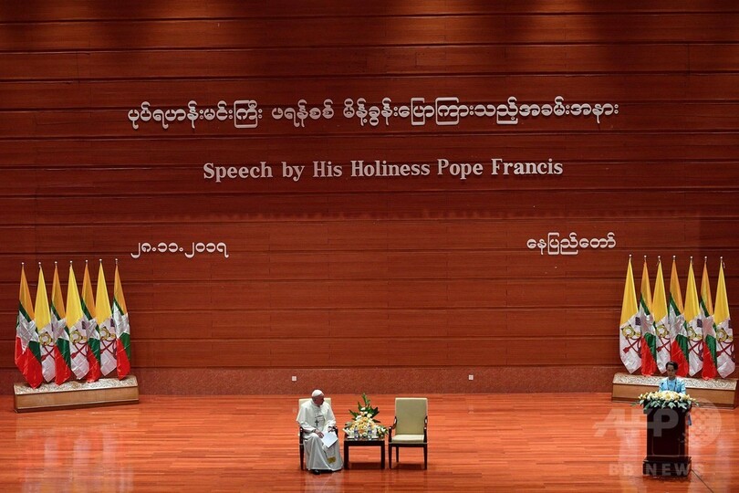 【11月28日 AFP】(更新、写真追加)ミャンマーを訪れているローマ・カトリック教会のフランシスコ(Francis)法王は28日、同国の事実上の指導者であるアウン・サン・スー・チー(Aung San Suu Kyi)国家顧問と会談した。また法王は演説で人権尊重を訴えたものの、イスラム系少数民族ロヒンギャ(Rohingya)への言及は避け、民族浄化との非難についても触れなかった。