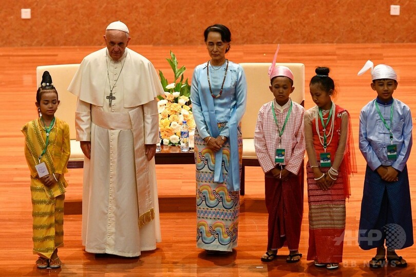 【11月28日 AFP】(更新、写真追加)ミャンマーを訪れているローマ・カトリック教会のフランシスコ(Francis)法王は28日、同国の事実上の指導者であるアウン・サン・スー・チー(Aung San Suu Kyi)国家顧問と会談した。また法王は演説で人権尊重を訴えたものの、イスラム系少数民族ロヒンギャ(Rohingya)への言及は避け、民族浄化との非難についても触れなかった。