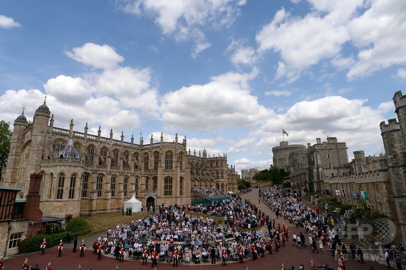 聖ジョージチャペルは、ヘンリー王子が洗礼を受けた場所であるほか、共に離婚歴のあるチャールズ皇太子(Prince Charles)とカミラ夫人(Camilla, Duchess of Cornwall)が挙式後に聖職者の祝福を受けた場所でもある。また、1837年から63年間にわたり続いたビクトリア朝以降を中心に、数多くの王族が同チャペルで挙式した。(c)AFP/Dario THUBURN