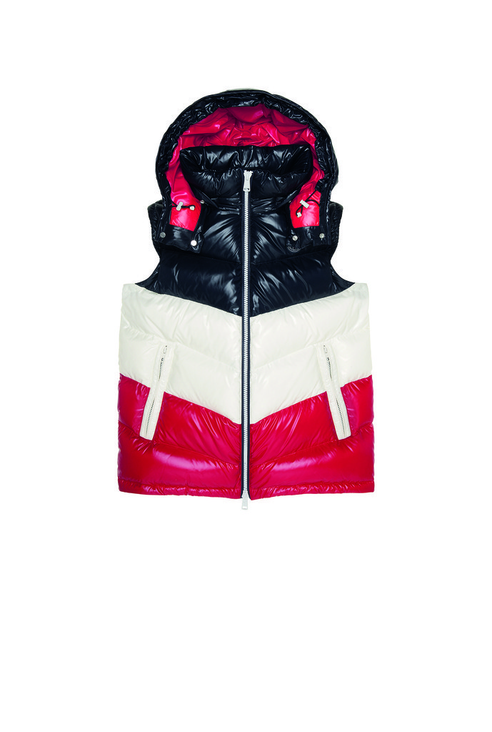 モンクレールのアイコンであるナイロンラケを用いたグラフィカルなアイテムは、バイカー調のパッディングや直線的に配置されたジップによって個性が際立つ。カラーパレットは、モンクレールのシグネチャーであるフレンチフラッグのトリコロールを基調に展開する。