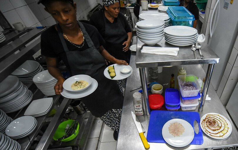 レストランで働く彼女らは、真新しいの黒のTシャツとエプロンを着用し、帯状のピンクの布で髪をまとめて作業に臨んでいた。受刑者150人のうち、厨房スタッフやウエートレスとして働いているのは15人。大半が殺人や麻薬取引の罪で収容された受刑者らで、2日間働くと刑期が1日短くなるのだという。