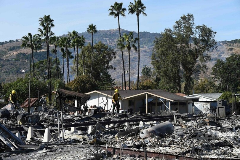 【12月10日 AFP】暴風にあおられた米カリフォルニア州南部の山火事は9日、ようやく火の勢いが衰えてきた。山火事による壊滅的な損害が明らかとなる中、住民や消防隊は一息つけることを期待している。