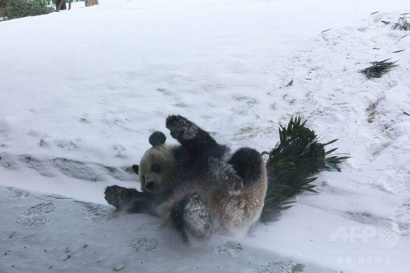 思嘉が雪の中で転げ回る姿に、来園客からは拍手や歓声まで上がっている。(c)CNS/JCM/AFPBB News