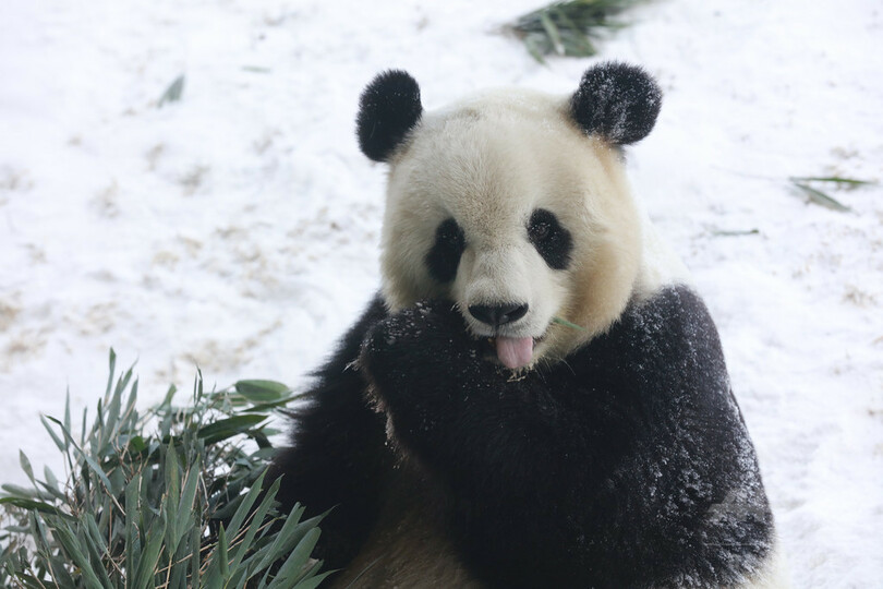 雪の中で大はしゃぎ! ジャイアントパンダの「思嘉」