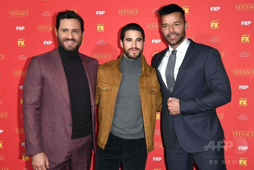 会場には、ヴェルサーチを演じたヴェネズエラ人俳優のエドガー・ラミレス(Edgar Ramirez)をはじめ、リッキー・マーティン(Ricky Martin)やダレン・クリス(Darren Criss)らが姿をみせた。(c) AFP