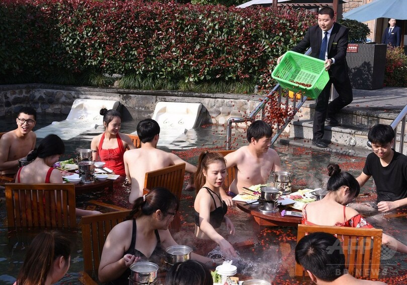 ニュース ライフ ちょっと斬新? 温泉でいただく鍋料理、中国 2017年12月12日 17:06 発信地:杭州/中国 [ 中国・台湾 中国 ] このニュースをシェア ‹ › ❮ 2/2 ❯ 中国浙江省杭州で、温泉の中で鍋を楽しむ客と、ナツメを湯の中に放り込む従業員(2017年12月10日撮影)。(c)AFP 画像作成中 ! 【12月12日 AFP】中国東部浙江(Zhejiang)省の杭州(Hangzhou)で、温泉に入りながら鍋を楽しむ人々の姿がみられた。(c)AFP ライフ 一覧へ> メディア・報道関係・法人の方向け 写真・動画 購入のお問合せ>