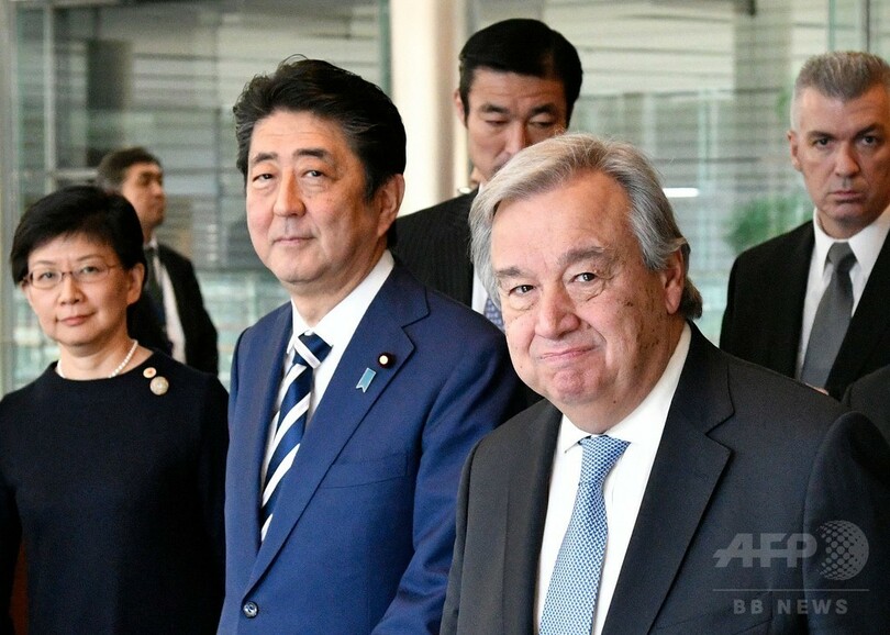 同氏と会談した安倍晋三(Shinzo Abe)首相は、安保理決議の完全履行の必要性に言及し、非核化に向けた意味のある対話になければならないとも述べた。(c)AFP