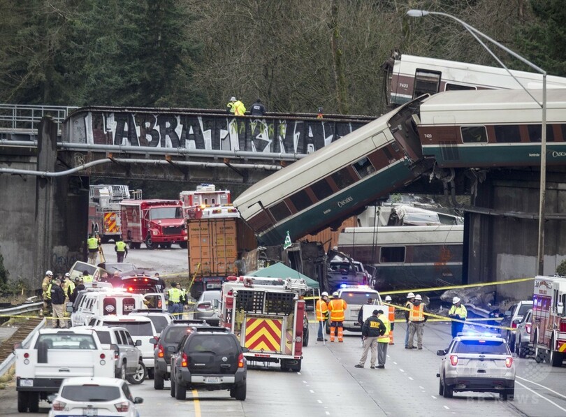 【12月19日 AFP】(更新、写真追加)米西部ワシントン州タコマ(Tacoma)近郊で18日早朝、高速鉄道「アムトラック(Amtrak)」の旅客列車が脱線し、一部が高架橋から高速道路に落下した。地元当局によると、これまでに少なくとも3人が死亡した。脱線した列車はこの日が運行初日だった。