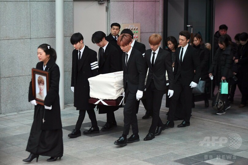 十字架の下にジョンヒョンさんの名が記された位牌をSHINeeのメンバー1人が、遺影をジョンヒョンさんの姉が持ち、残りのSHINeeメンバー3人と、所属事務所が同じ韓国の男性アイドルグループ「SUPER JUNIOR(スーパージュニア)」のメンバー3人が棺(ひつぎ)を運んだ。
