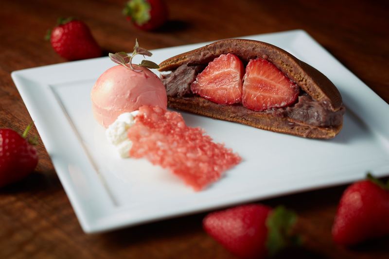 旬にこだわった新鮮な食材をライブ感溢れる鉄板焼きで楽しめる同店からは、人気デザートのどら焼きに、旬の苺「あまおう」をつかった新作が登場。北海道産の小豆をつかったつぶ餡とこし餡に生クリームを混ぜ、苺をまるごと1個加え、黒糖入りの生地で挟んだユニークなスイーツに仕上がった。苺の砂糖菓子を添えて、自家製の苺シャーベットとともに味わって。生地を焼くところから鉄板の上でつくりあげるので、ライブ感も楽しめそうだ。