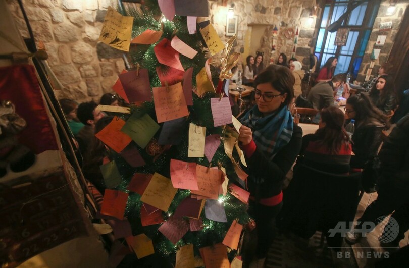 【12月22日 AFP】シリアの首都ダマスカスにあるコーヒーショップ「Zeriab」に飾られているクリスマスツリーには、ティンセルなどの飾りの代わりに、シンプルな電飾1つと、人々の希望と祈りが書かれた色とりどりの紙片が飾られている──。これらの小さな紙片につづられているのは、7年近く戦禍にあえいでいる人々らの願いだ。