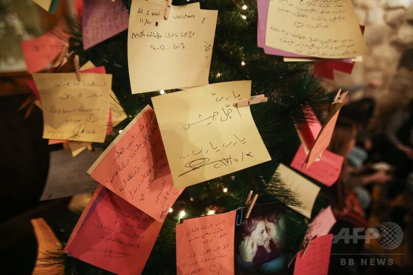 【12月22日 AFP】シリアの首都ダマスカスにあるコーヒーショップ「Zeriab」に飾られているクリスマスツリーには、ティンセルなどの飾りの代わりに、シンプルな電飾1つと、人々の希望と祈りが書かれた色とりどりの紙片が飾られている──。これらの小さな紙片につづられているのは、7年近く戦禍にあえいでいる人々らの願いだ。
