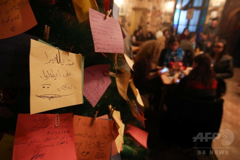 【12月22日 AFP】シリアの首都ダマスカスにあるコーヒーショップ「Zeriab」に飾られているクリスマスツリーには、ティンセルなどの飾りの代わりに、シンプルな電飾1つと、人々の希望と祈りが書かれた色とりどりの紙片が飾られている──。これらの小さな紙片につづられているのは、7年近く戦禍にあえいでいる人々らの願いだ。