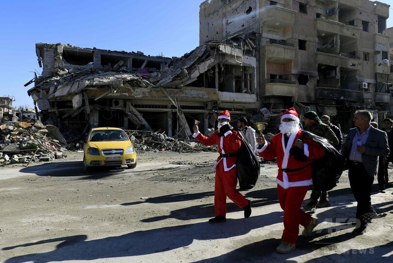 ニュース ライフ 荒廃したラッカ市内にサンタクロース登場 子どもの笑顔を誘う 2017年12月28日 13:09 発信地:ラッカ/シリア [ 中東・北アフリカ シリア ] このニュースをシェア ‹ › ❮ 3/7 ❯ シリア北部ラッカで、破壊された建物の横を通り過ぎるサンタクロースの格好をした男性ら(2017年12月26日撮影)。(c)AFP PHOTO / Delil souleiman 画像作成中 ! 【12月28日 AFP】内戦で荒廃したシリア北部の都市ラッカ(Raqa)で26日、サンタクロースの格好をした男性2人が現れ、子どもたちに笑顔で迎えられた。破壊された建物の横を通り過ぎて中心部にある大きな被害を受けた教会に立ち寄り、その場にいた家族におもちゃを配った。 ラッカは、イスラム過激派組織「イスラム国(IS)」が首都と位置けて支配下に置いていたが、10月に米軍の支援するクルド人とアラブ人の合同部隊「シリア民主軍(SDF)」が奪還に成功している。(c)AFP/Delil Souleiman ライフ 一覧へ> メディア・報道関係・法人の方向け 写真・動画 購入のお問合せ>