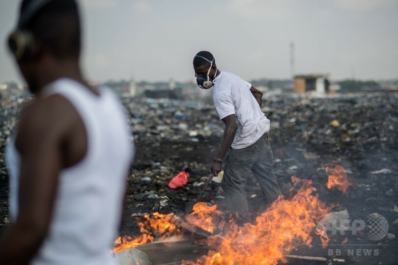 【1月27日 AFP】ガーナの首都アクラ(Accra)にある世界最大規模の電子機器廃棄場で、ジョセフ・アウワダルコ(Joseph Awuah-Darko)さん(21)は椅子に座り、黒ずんだ地面の上で燃えるポリスチレンと絶縁ケーブルを見つめている。