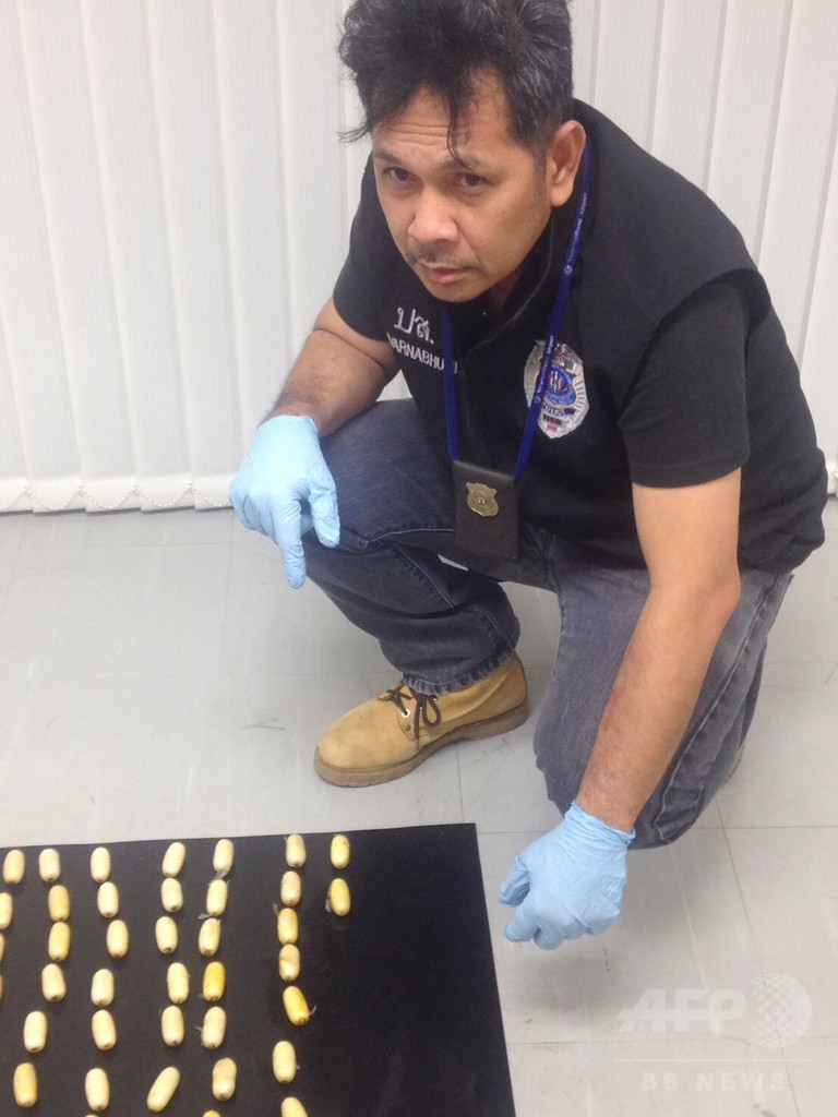 タイの薬物統制委員会(Office of Narcotics Control Board)事務局長によると、エックス線検査により女の腹部にコカイン計1.2キロの入った包み60袋以上があることが判明したという。