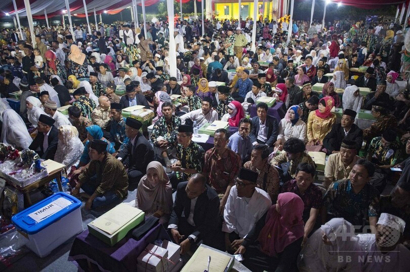 【1月1日 AFP】インドネシアの首都ジャカルタで大みそかの12月31日夜、無料の集団結婚式が行われ、合わせて437組のカップルが参加した。法的に夫婦でないため、公共サービスなどを受けるのに苦慮している市民の負担を和らげるため市当局が開催したもの。
