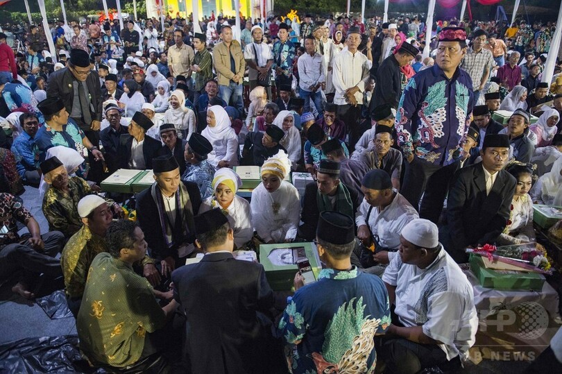 【1月1日 AFP】インドネシアの首都ジャカルタで大みそかの12月31日夜、無料の集団結婚式が行われ、合わせて437組のカップルが参加した。法的に夫婦でないため、公共サービスなどを受けるのに苦慮している市民の負担を和らげるため市当局が開催したもの。