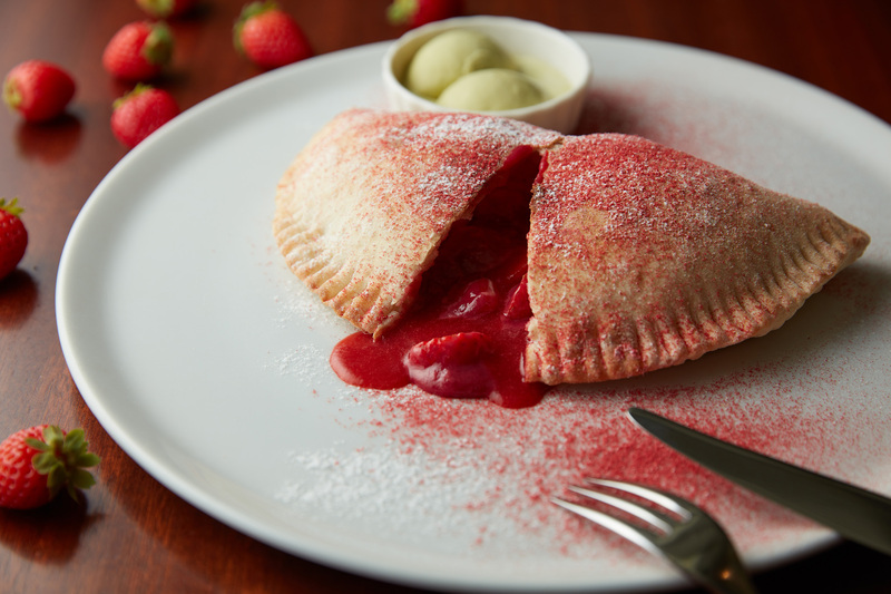 オーセンティックかつ旬の素材を活かした料理に定評があるイタリアン カフェからは、苺のチョコレートソースがとろける温かいカルツォーネやラヴィオリでチョコレートを包んだ新感覚デザートが登場。ナイフを入れると、苺やホワイトチョコレートソースが“とろっと”とろけ出る仕掛けになっている。添えられた自家製ピスタチオアイスを混ぜて“あったかつめたい”スイーツとしても楽しめる。また、ローズヒップを練りこんだパスタ生地でチョコレートを包んだラヴィオリを、苺のスープに浮かべた新作デザートも展開。ストロベリー味の砂糖菓子を添えた自家製バニラアイスとともに、新感覚のデザートパスタを味わってみて。