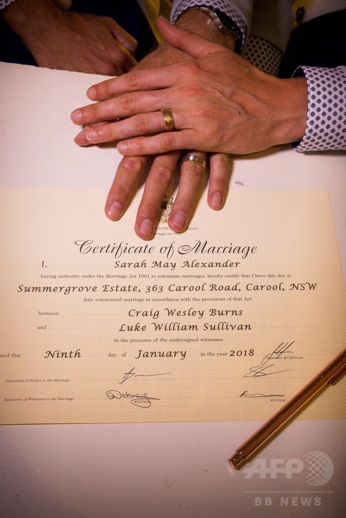 挙式したのはコモンウェルスゲームズ(Commonwealth Games、英連邦競技大会)の陸上選手、ルーク・サリバン(Luke Sullivan)さん(23)とクレイグ・バーンズ(Craig Burns)さん(29)。ニューサウスウェールズ(New South Wales)州郊外カルール(Carool)で日付が9日に変わった直後、花火が打ち上げられる中で結婚の誓いの言葉を述べ、キスを交わした。
