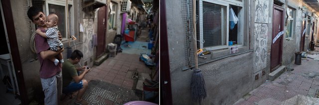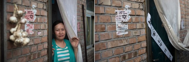 ある日、私たちが集落に行ってみると、ほとんど誰もいなくなっていた。私が撮影した一帯の大半は封鎖され、建物の入り口は開けられないように固定され、鉄条網が巻かれていた。扉が一つ開いていて私たちは中へ入ってみた。この集落の中でも特に活気にあふれ、たくさんの写真を撮影した一角だった。そこが、ゴーストタウンと化していた。撮影を始めると、前に撮った場所がいくつも思い出された。