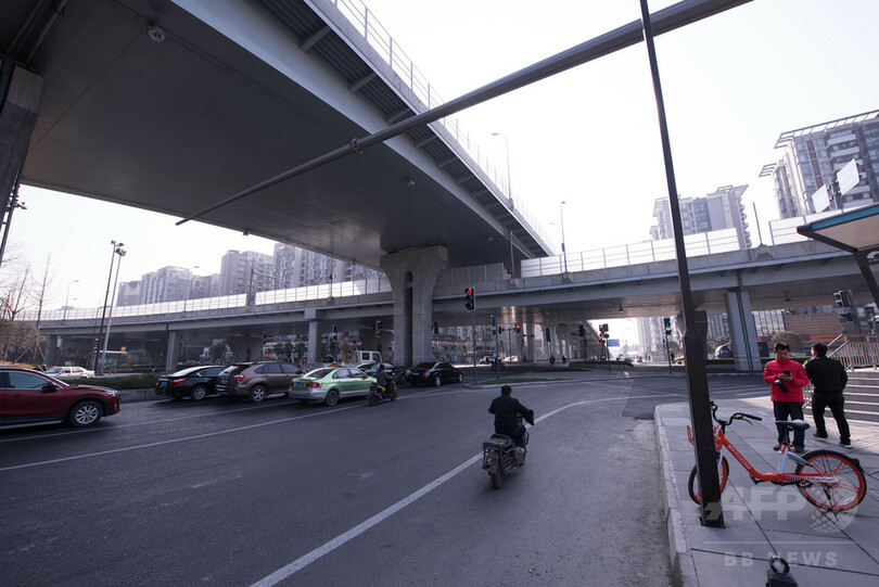 交差点の上のジャンクションが、信号が多い原因の一つのようだ。駅前の交差点でもあり、歩行者にとっては見渡す限り信号がある。成都で最も信号が多い交差点と呼ばれている。(c)CNS/JCM/AFPBB News