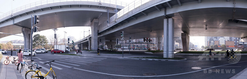 交差点の上のジャンクションが、信号が多い原因の一つのようだ。駅前の交差点でもあり、歩行者にとっては見渡す限り信号がある。成都で最も信号が多い交差点と呼ばれている。(c)CNS/JCM/AFPBB News